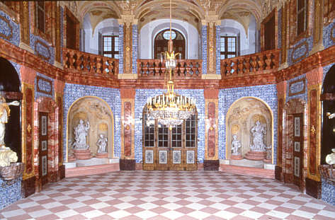 Schloss FavoriteSala Terrena Rechteckiger Raum mit abgeschrägten Ecken im Erdgeschoss des Schlosses, öffnet sich nach oben bis zur Dachlaterne. Blaue Fayencefliesen kontrastieren mit den rot-weißen Sandsteinplatten des Bodens und dem roten Stuckmarmor an Türgewänden und Wandpfeilern. |