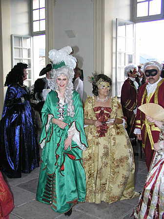 Während die fürstliche Leibgarde sich vor dem Festsaal des Residenzschlosses präsentiert, ergehen sich die zum Maskenball geladenen Damen und Herren im Foyer.