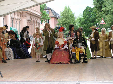 Markgraf Ludwig Wilhelm und Markgräfin Sibylla Augusta wohnen den Darbietungen der Musikgruppe Agua viva und von I Danzatori palatini bei.