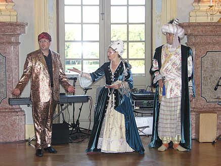 Anneliese Almasan (Schlösser & Gärten) und Ulrich Reich (Service-Center Rastatt, rechts) im persischen Kostüm, Thomas Angelou (Service-Center Rastatt) in einer indisch inspirierten Seidenkreation bei der Begrüßung der Gäste