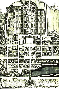 RastattResidenz des Markgrafen von Baden-Baden Charakteristisch für die planmäßige Verbindung von Schloß und Stadt sind die drei nach Versailler Vorbild auf das Schloß zuführenden Straßen, die man auch im Luftbild sehr gut erkennt. Nach Nordosten zu führt eine Achse direkt auf das Schloss Ettlingen zu; ihre Länge beträgt 17,2 km. |