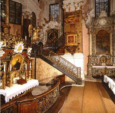 Kommunionbank, Kanzel und Chorstiege von der Seite gesehen