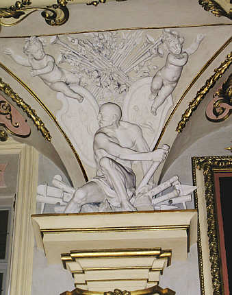 Stuckfiguren als Bekrönungen der Kolossalpilaster:
