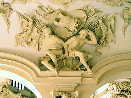 Unter der Decke des Oberen Vestibüls gefangene und angekettete Türken als Stuckfiguren: Sinnbild für den militärischen Erfolg in den Türkenkriegen.
