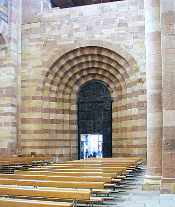 Die Innenseite des Westbaus von 1043 zeigt noch das originale romanische Stufenportal mit den abwechselnd gesetzten gelben und roten Sandsteinbändern.
