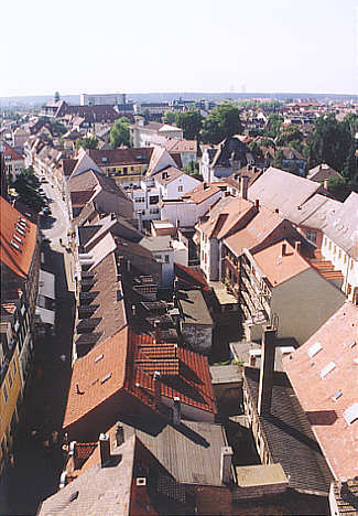 Blick von der Plattform des Altpörtel auf die Roßmarktstraße (links), die hier dem Zug der alten Stadtmauer folgt. Rechts zwischen den Häusern die Karmeliterstraße, die außerhalb der ehemaligen Mauer liegt.