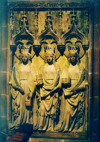 Worms, DomNikolauskapelleDreijungfernstein Der drei Jungfernstein aus dem abgebrochenen Bergkloster vor den Andreastor stellt nach seiner Inschrift die Heilige Embede, Warbede und Willebede, nach der Legende Gefährtinnen der Heiligen Ursula, dar. Sie werden als jugendliche Prinzessinnen in einem spätgotischen Rahmen mit Büchern und Palmen in den Händen dargestellt.