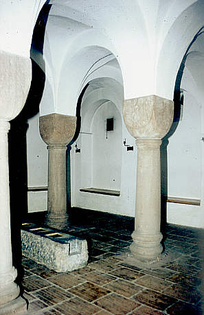Krypta aus dem frühen 11. Jahrhundert (Regierungszeit des Bischofs Burchard). Vier Säulen mit Würfelkapitellen teilen den kleinen, 4,5 m im Quadrat messenden Raum in 9 Joche.