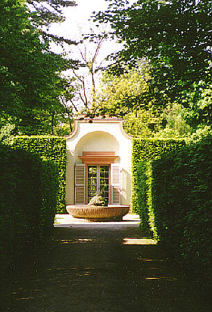Schlossgarten SchwetzingenAuf dem Weg zum BadhausEs scheint nur eine Tür zu sein, die hier transparent den Weg abschließt. Am Brunnen angekommen, sieht sich der Gast auf einer heiter sonnendurchfluteten Fläche und steht vor dem Gebäude, das sich Kurfürst Karl Theodor von seinem Architekten Nicolas de Pigage als Refugium und privatesten Aufenthalt hat bauen lassen - dem Badhaus |