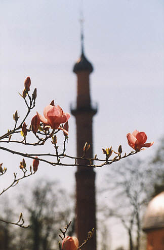 Der Garten hinter der Moschee entfaltet seinen vollen Zauber im Frühling zur Magnolienbüte, jat aber durch das Spiel von Licht und Schatten sowie die wechselnden Blicke zu den Minarett-Türmen zu jeder Jahreszeit seinen besonderen Reiz.