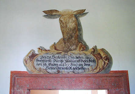Gemalter Hirschkopf mit ursprünglich echtem Geweih: "Den 20. September 1719 haben Ihro Hochfürstl. Durchlaucht Pfalzgraf diesen Hirsch von 16 Enden auf der Hard an dem Schneiderspfad geschossen."