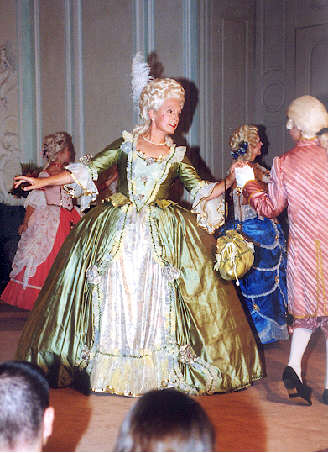 Mode des RokokoDie Zeit des Rokoko setzt die Traditionen von Unter- und Obergewand fort. Das Oberkleid ist am Rockteil wieder offen und zeigt das hellere Untergewand, das an Ärmel und Ausschnitt wieder mit reichen Spitzen und Rüschen besetzt ist. |
