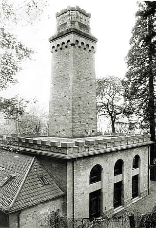 Entlüftungsanlage eines EisenbahntunnelsEntlüftungsgebäude für den ehemaligen Königstuhltunnel auf der Strecke Heidelberg - Neckargemünd. Der 1909 - 1914 gebaute Tunnel für den Betrieb mit Dampfloks war 1,5 km lang und benötigte auf halber Strecke eine Entlüftung. Der Tunnel wurde nach dem Neubau des Heidelberger Bahnhofs und dem Bau des neuen Tunnels für den Straßenverkehr umgebaut. Die Entlüftung wurde stillgelegt. |
