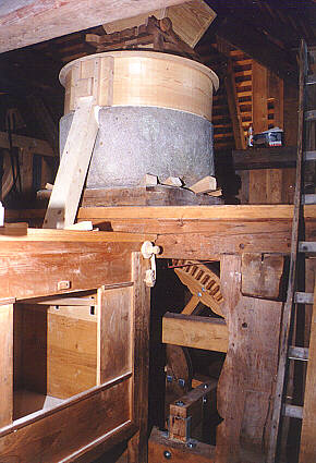 das Zahngetriebe den Mühlstein (Läuferstein) an.