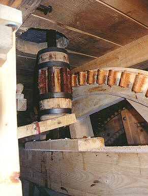 Schwarzwälder BauernmühleUmwandlung der DrehbewegungDie vom Mühlrad erzeugte horizontale Drehbewegung wird inneerhalb des Bietgerüsts über ein Zahngetriebe in eine vertikale Rotation umgewandelt. Das große Zahnrad wird vom Mührad unmittelbar über die große Welle angetrieben und dreht das kleine Zahnrad, das seinerseits den darüberliegenden Mühlstein dreht. |