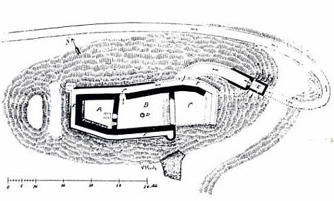 Grundriss der Burganlage, bestehend aus zwei kleineren Palasgebäuden und einem dazwischen liegenden Innenhof.