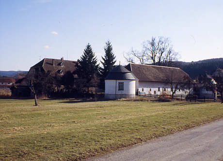 Rechts die Ökonomiegebäude, links das Wohngebäude, vorn der nordwestliche Ecktum auf stauferzeitlichen Fundamenten