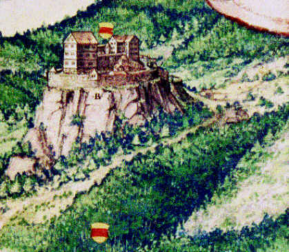Deutlich sichtbar die exponierte Lage der Burg Geroldseck auf dem Porphyrfelsen.Der Felssturz zum Umland hin ist allerdings unrealistisch gezeichnet, er besteht nur zwischen der Unter- und der Oberburg. Die Burg selbst besteht aus zwei Häusern, "altes Haus" und "neues Haus" genannt, durch einen Hof mit Verbindungsmauer getrennt.