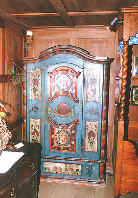 Schlafzimmer mit Himmelbett und bemaltem Bauernschrank