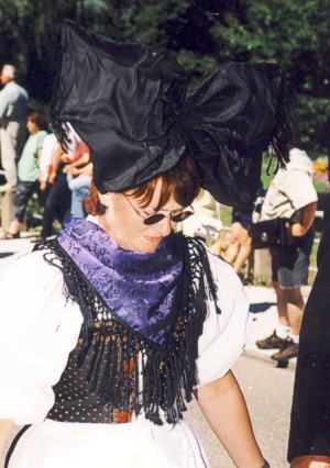 Die Frau trägt die Hanauer Hörnerkappe,