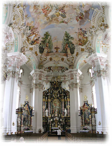 Der Innenraum besteht aus einem Oval, dessen Decke von 10 Pfeilern getragen wird. Im Osten schließt sich ein querovaler Altarraum an.
