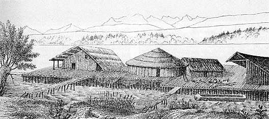 Zürichsee nach der Abbildung einer Pfahlbausiedlung von