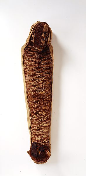 Mumie eines Erwachsenen in geometrischer Umwicklung mit