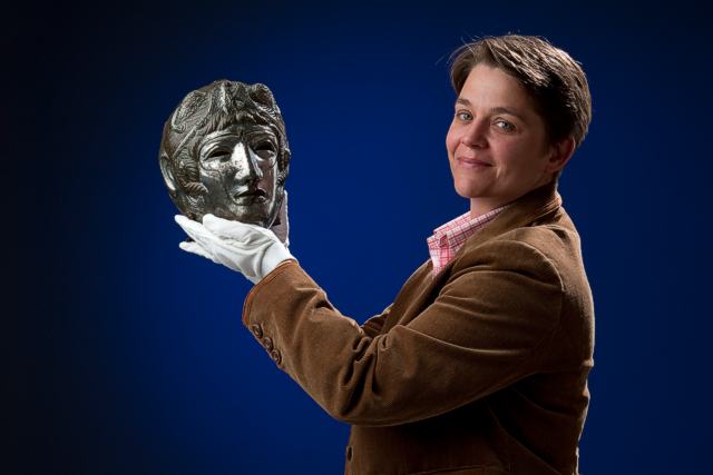 Dr. Nina Willburger, Referatsleiterin Klassische und Provinzialrömische Archäologie, mit römischem Maskenhelm.
