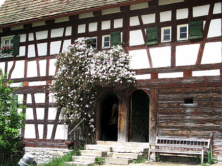 Zugang zum Wohnbereich (links) und zum Stall (rechts). Über dem Stall im Obergeschoss die zur oberen Wohnung gehörende Stallkammer.