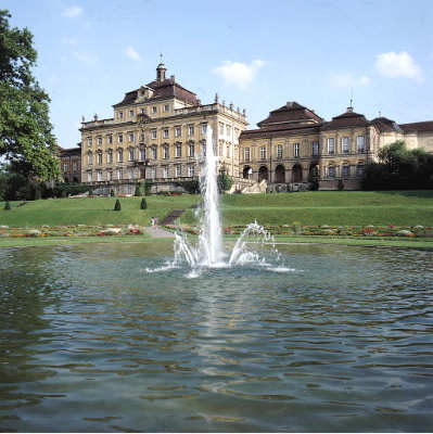 Fürstenbau (1704), Spiegelgalerie und westlicher Pavillon (1714/15) vom Parterre des Barockgartens aus gesehen.