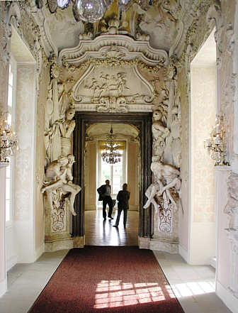 Östliche Galerie vom Thronsaal zum Spielpavillon, 1714/15 durch Johann Driedrich Nette dem Alten Corps de Logis angefügt. Detail: Umrahmung der Tür zum Spielpavillon