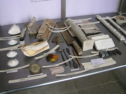 Arbeitsgeräte und Rohprodukte eines Stukkateurs |