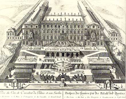 Nordansicht des Schlosses mit dem Entwurf zu einem Terrassengarten, der allerdings nur zum Teil verwirklicht wurde.