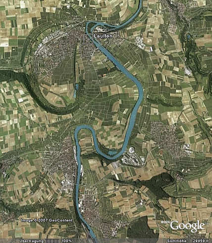 Satellitenaufnahme des Neckarlaufs mit der alten, in Lauffen abgeschnittenen Neckarschlinge. Im nördlichen Teil verläuft die Straße Richtung Brackenheim, der Südhang des Tals ist mit Weinbergen bepflanzt.