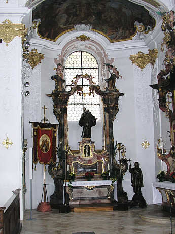 Seitenaltar im Querhaus mit der Krippe des Heiligen Fidelis (Markus Roy, 1577 - 1611, gestorben als Märtyrer)