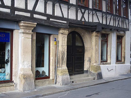 Renaissanceportal eines Bürgerhauses in der Altstadt, das Haus selbst mit steinermem Untergeschoss und Fachwerk-Obergeschossen