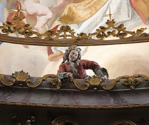 Weltenburg, Detail aus dem Deckenfresko der Klosterkirche: Stuckfigur