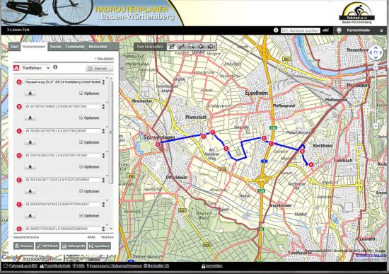 Radroutenplaner mit der Teststrecke Heidelberg-Kirchheim - Schwetzingen.