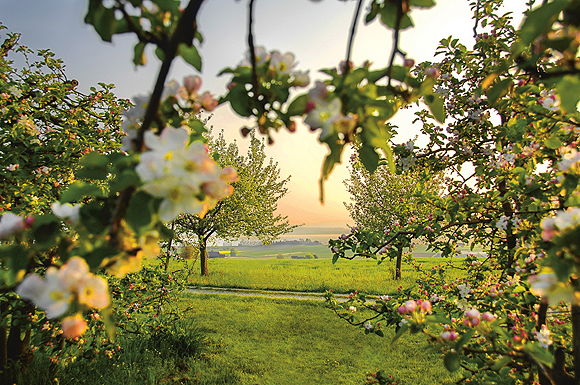 Apfelbäumen auf und locken Bienen und Ausflügler gleichermaßen.