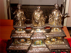 Dreikönigsschrein in der Domkirche in Köln. Foto: Wikimedia Commons /Arminia (CC-BY-SA 4.0)Reliquiar der Heiligen Drei Könige. Kirche S. Bartholomeo, Bargherio. Foto: Wikimedia Commons /Erasmus 89 (CC-BY-SA 4.0)