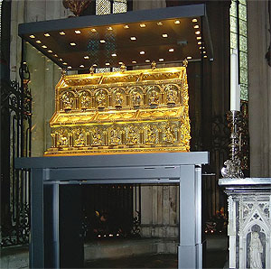 Ab 1158 wird ihr Schicksal aktenkundig. Vor der Bedrohung durch Barbarossa werden sie in Sicherheit gebracht, nach der Eroberung Mailands erhält sie 1164 der Kölner Erzbischof zum Geschenk und bringt sie nach Köln mit. Dort ruhen sie bis heute in einem riesigen Reliquienschrein, dessen Bau im 13. Jahrhundert angefangen, im 15. Jahrhundert unterbrochen und im 19. Jahrhundert erst vollendet wurde. Die Rede ist vom Kölner Dom, dem Gotteshaus, das gebaut wurde, um dem goldenen Schrein der Heiligen eine würdige Stätte zu geben.