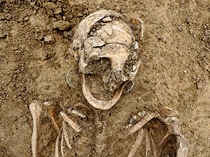 Darunter: Detail Schädel mit Ohrringen und Perlen des frühmittelalterliches Frauengrab