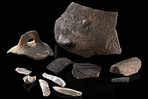 Verzierte Feinkeramik, Feuersteinklingen aus Jurahornstein und ein Pfeilschaftglätter aus Sandstein, Foto: Y. Mühleis/LAD