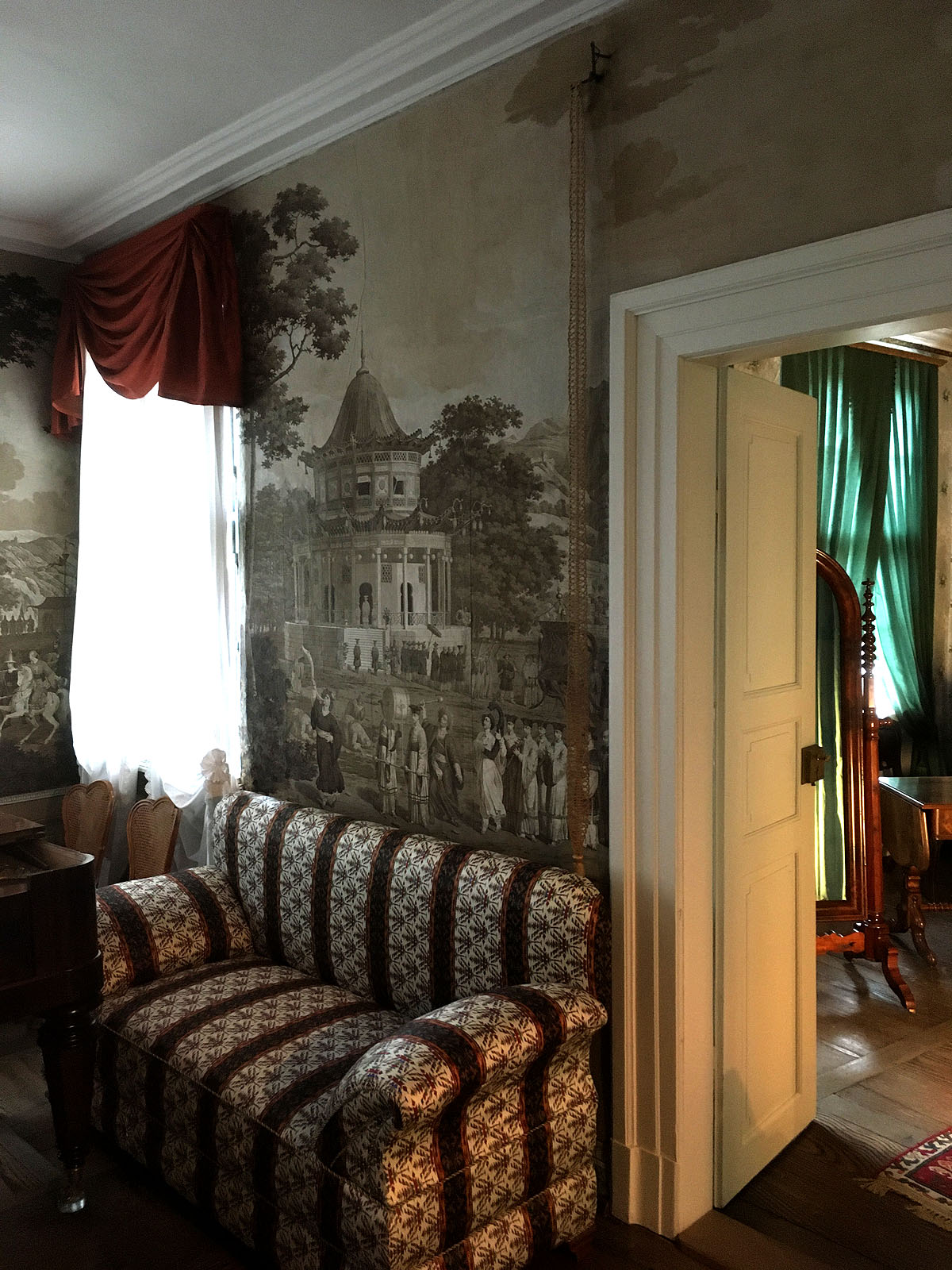 Wir durchstreiften nicht das Schloss in seiner Gänze, sondern bewunderten nur die goldgeprägten Ledertapeten (um 1720) – mit solchen Tapeten schmückte auch unser Kurfürst Carl Ludwig im 17. Jahrhundert sein Schloss Schwetzingen aus – sowie die beiden Chinoiserien, die Vogeltapete (um 1780) und die China-Tapete (1814). Die Räume des 19. Jahrhunderts selbst sind ziemlich vollgestellt, und man darf hoffen, dass die Restauratoren sich dabei auf ausreichende Inventare stützen konnten.