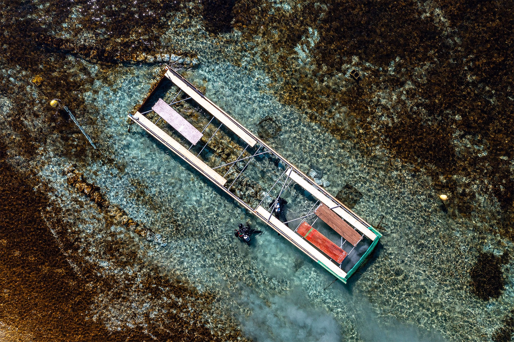 Blick auf den eingehausten Einbaum mit Forschungstauchern aus der Luft