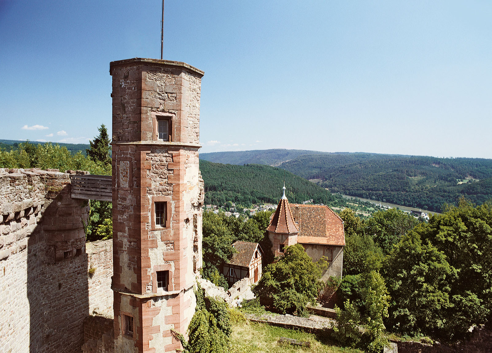 (ssg) Der höchste Turm der Burgfeste ist weithin zu sehen: Der sechseckige Bergfried überragt noch heute die Burg und das kleine Städtchen Dilsberg auf der Kuppe hoch über einer Neckarbiegung. Die Burganlage beeindruckt nicht nur durch ihre hoch aufragenden Mauern, sondern bietet auch einen spektakulären Blick über das Flusstal und die Hügelzüge des Odenwalds.