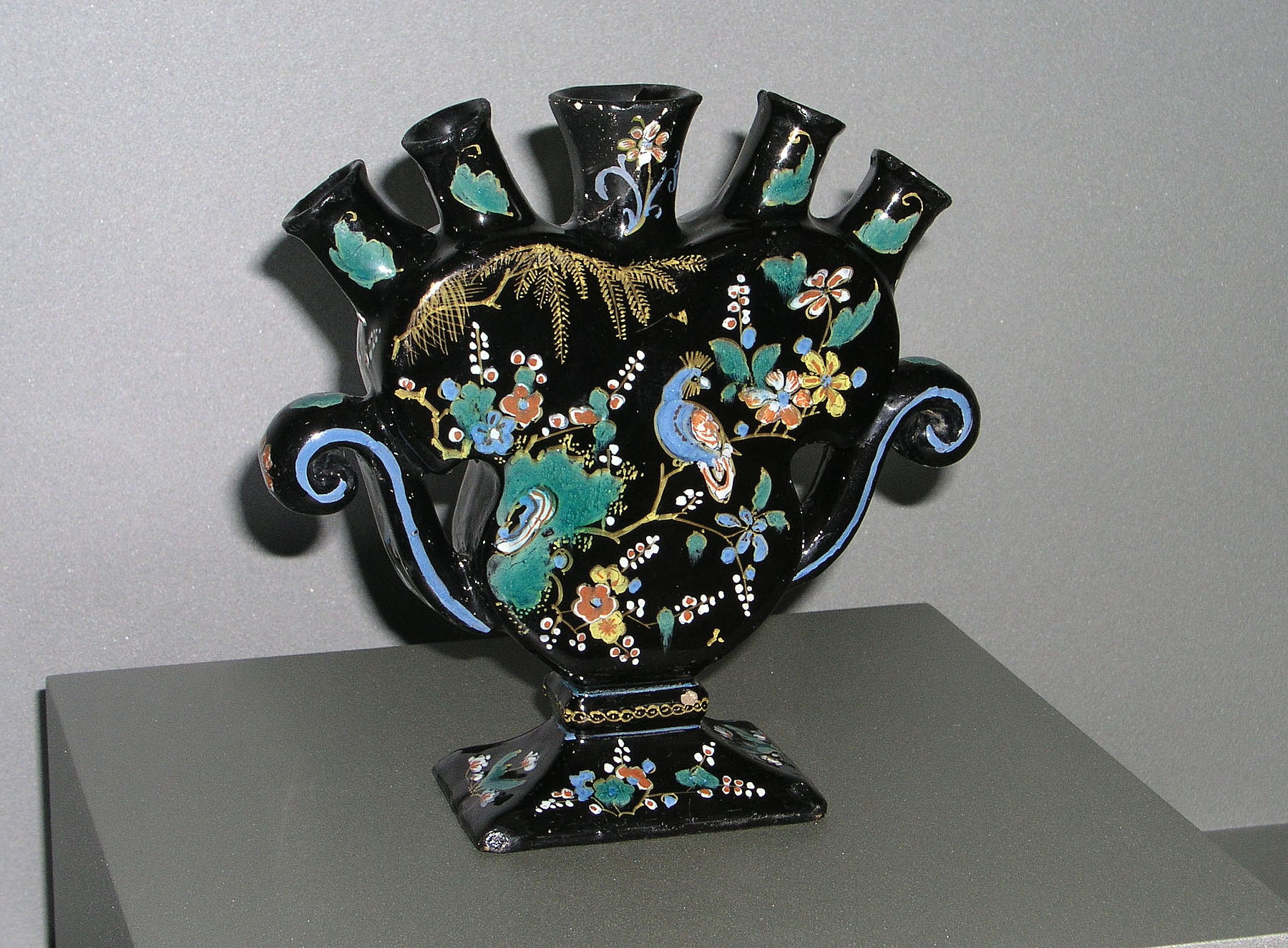 Schloss Favorite: Blumenvase, Delft, 1700 - 1725. Fayence, Scharffeuertechnik, polychrom auf schwarzem Fond. Burüssel, Musées royaux d'Art et d'Histoire.