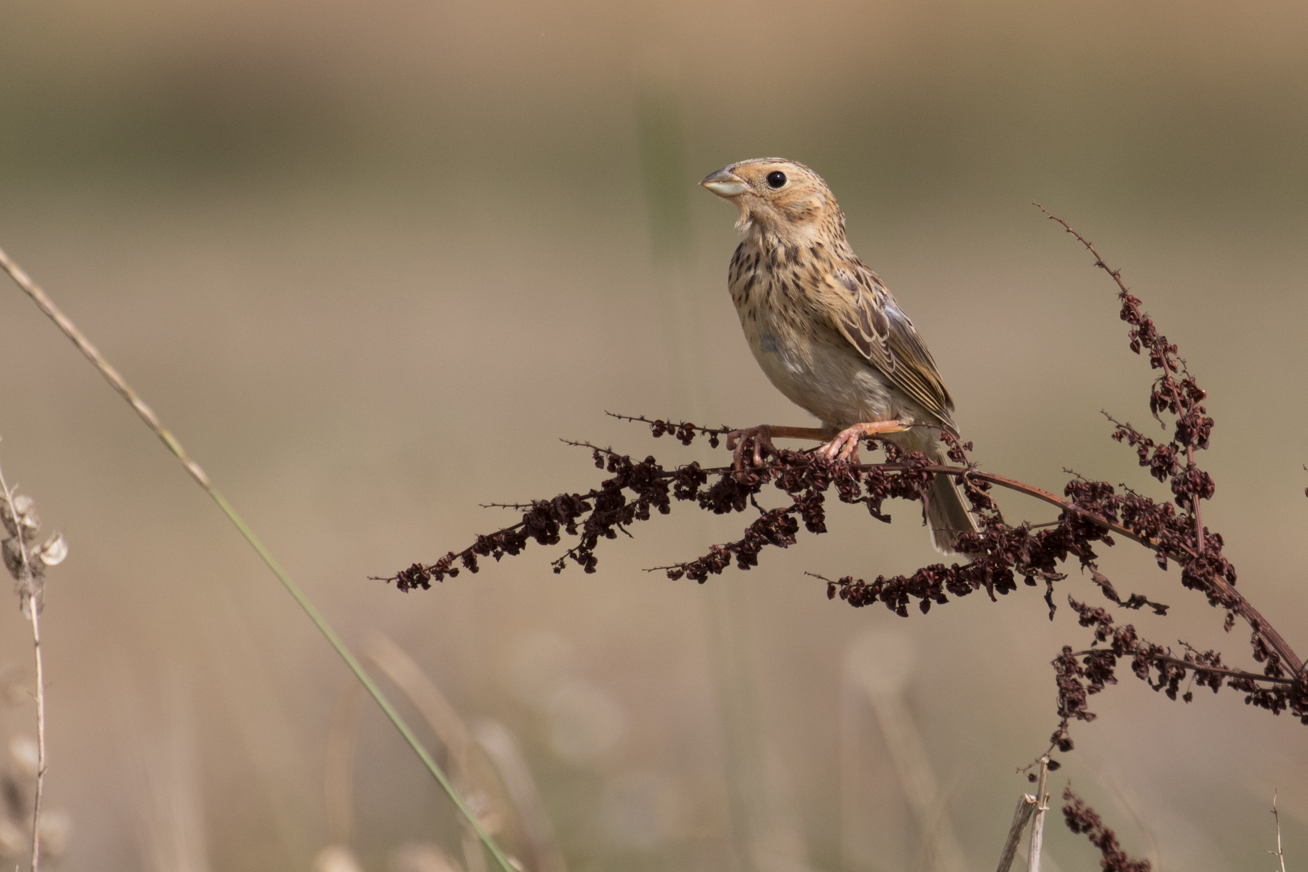 Eine Grauammer hat sich auf einer mehrjährigen Ackerbrache niedergelassen. Foto: Heiner Götz, Universität Tübingen