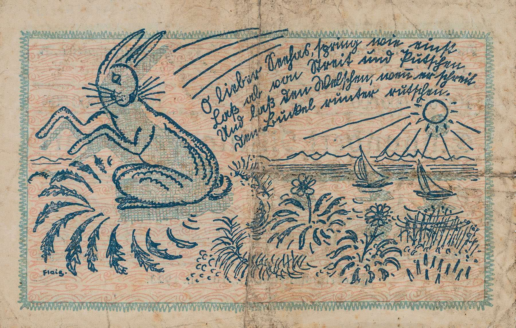 Waldemar Flaig Seehaas am Bodenseeufer (Inflationsgeldschein), 1923 Offsetdruck 13 x 18 cm Zeppelin Museum Fried-richshafen © Zeppelin Museum Friedrichshafen