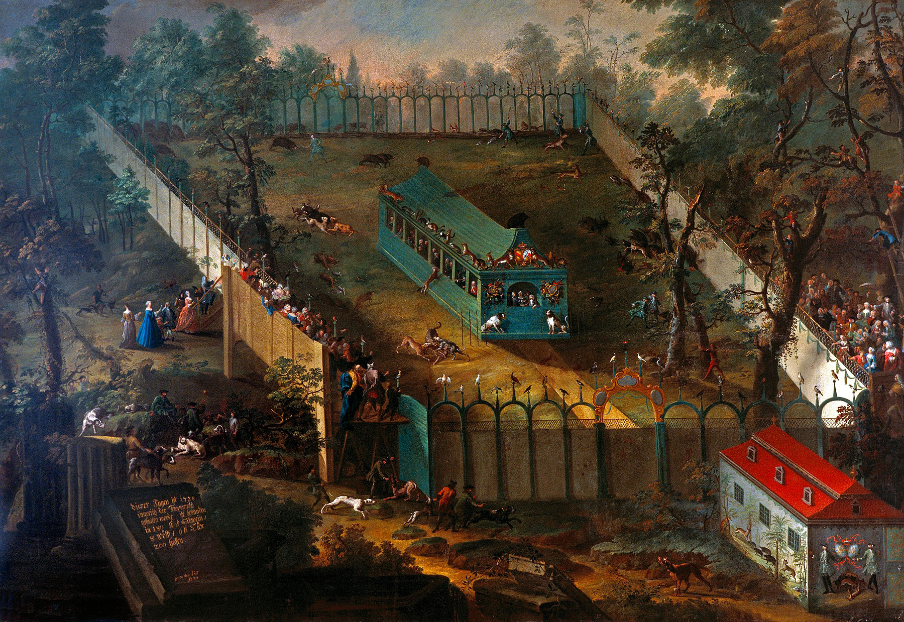 Ein Bild im Kapellenzimmer des Appartements der Markgräfin in Schloss Favorite Rastatt zeigt eine „eingestellte Jagd“, die 1738 beim Schloss stattfand. Unzähliges Wild wurde Tage, wenn nicht sogar Wochen, vorher zusammengetrieben. Vor allem die Bauern der Umgebung wurden zu diesen Arbeiten herangezogen. Am eigentlichen Tag der Jagd trieben die Diener dem Fürsten das Wild direkt vors Gewehr – er musste nur noch abdrücken. Eine eingestellte Jagd war ein blutiges Spektakel, bei dem hunderte Tiere geschossen wurden. Und zugleich eine wahre Attraktion für die edlen Damen und Herren: Zahlreiche Adlige kamen zum Schloss Favorite, um das Jagdevent zu beobachten. Der Markgraf stellte seinen Reichtum vor aller Augen zur Schau. Das Bild von Heinrich Lihl aus dem Jahr 1738 zeigt dies eindrücklich.